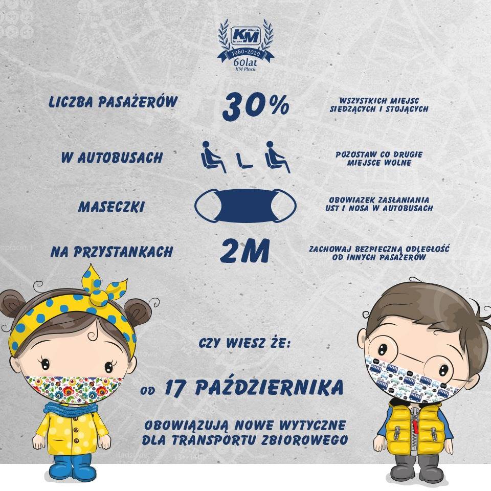 Zgodnie z rozporządzeniem Rady Ministrów od soboty (17 października) w autobusach Komunikacji Miejskiej – Płock może podróżować tyle osób, ile wynosi połowa miejsc siedzących lub 30 proc. wszystkich miejsc (siedzących i stojących) w pojeździe. Przy jednoczesnym zachowaniu zasady, że połowa miejsc siedzących musi pozostać wolna.