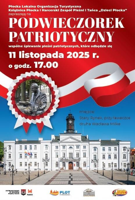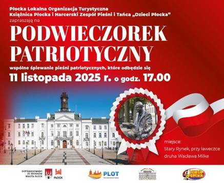Płocka Lokalna Organizacja Turystyczna, Książnica Płocka im. Wł. Broniewskiego i Harcerski Zespół Pieśni i Tańca „Dzieci Płocka” im. druha Wacława Milke serdecznie zapraszają na Podwieczorek Patriotyczny. 11 listopada 2025 r. o godz. 17:00 spotkajmy się wspólnie na płockiej starówce, by w wyjątkowy sposób uczcić Narodowe Święto Niepodległości! Czeka nas niezapomniany wieczór pełen pieśni patriotycznych, które zaśpiewamy wspólnie z Harcerskim Zespołem Pieśni i Tańca „Dzieci Płocka” oraz Chórem działającym przy Szkole Podstawowej nr 5 im. Władysława Broniewskiego w Płocku. Śpiew tradycyjnie opatrzony będzie gawędą historyczną - przybliżającą 200-letnią historię płockiego ratusza. Dla wszystkich uczestników przygotowaliśmy: - Śpiewniki z tekstami pieśni - Patriotyczne gadżety – wstążeczki, flagi, wiatraczki - Ciepłą atmosferę i ducha wspólnoty To doskonała okazja, by razem – niezależnie od wieku – wyrazić dumę z naszej historii i wspólnie przeżyć ten wyjątkowy dzień. - Gdzie? Plac Starego Rynku w Płocku - Kiedy? 11 listopada 2025 r., godz. 17:00 Przyjdź z rodziną, przyjaciółmi, sąsiadami – śpiewajmy razem dla Niepodległej! Projekt realizowany jest dzięki dofinansowaniu ze środków miasta Płock.