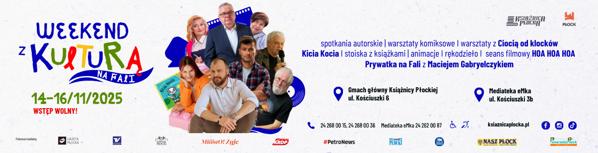 Wszystkie wydarzenia odbędą się w Książnicy Płockiej (ul. Kościuszki 6) i Mediatece eMka (ul. Kościuszki 3b).