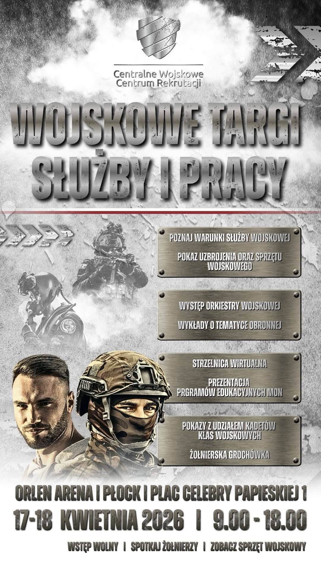 Ministerstwo Obrony Narodowej oraz Centralne Wojskowe Centrum Rekrutacji zapraszają 17 - 18 kwietnia 2026 r. (piątek - sobota) na Wojskowe Targi Służby i Pracy w m. Płock oraz w 15 innych miastach. To szansa dla wszystkich, którzy chcą zasilić szeregi Wojska Polskiego, oraz podjąć nowe wyzwania w swoim życiu.